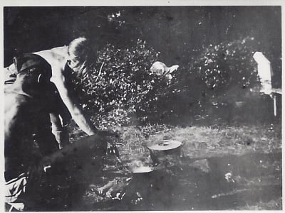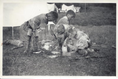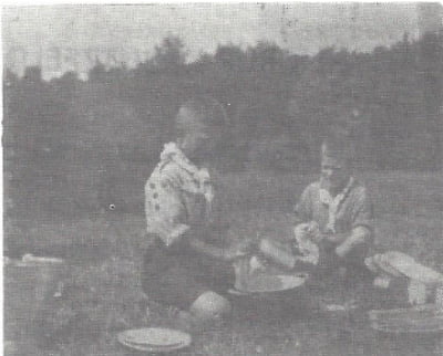 Troppens første sommerlejr 1920 i Hejede ved Faxe. Her er to mand i gang med opvasken.